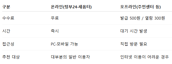 마지막으로 온라인과 오프라인 발급의 차이를 간단히 정리해 보겠습니다.