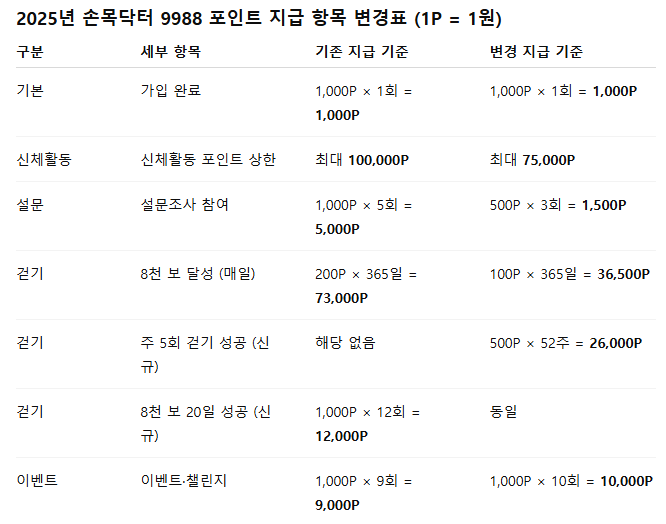 2025년 기준, 손목닥터 9988의 포인트 지급 내역은 다음과 같이 조정되었습니다.